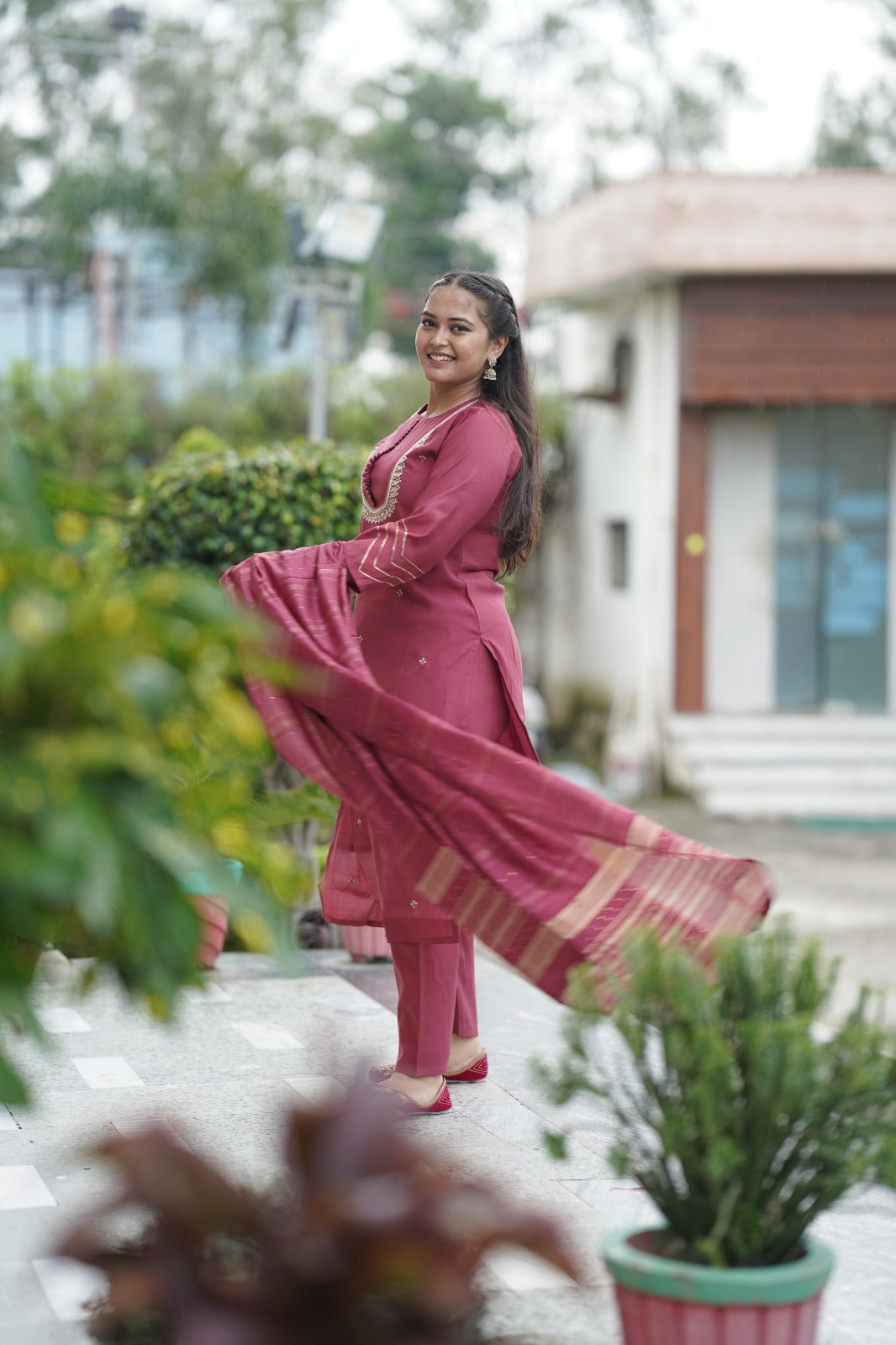 Elevate your ethnic wardrobe with this elegant Roman Silk Shirt featuring a unique neck design that adds a royal touch. Paired with soft silk pants and a silk self-design dupatta, this set is perfect for festive occasions, weddings, and special gatherings.